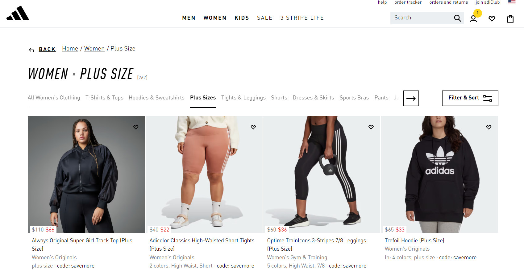 - Интернет-магазин Adidas в США предлагает женскую одежду Plus Size и Maternity, в Украину они практически не поставляются;