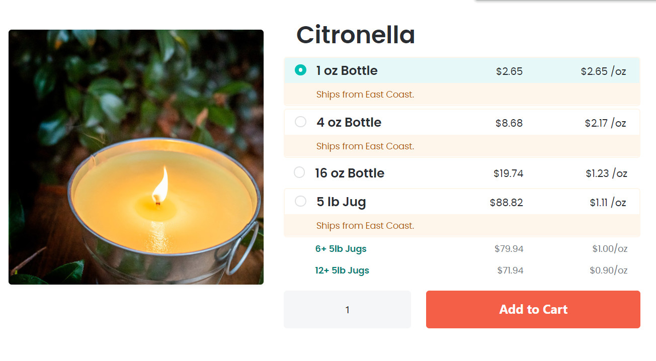 Некоторые ароматические масла можно заказать и в большем объеме. Это удобно для тех, кто использует их часто и в больших количествах, поскольку, чем больше объем, тем дешевле цена за одну унцию.